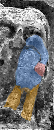 descendent derrière les oreilles , la bouche est ouverte. Le personnage est habillé d'une robe de motifs en reliefs, il semble avoir une chemise dont vous en voyez le col. Il pourrait avoir une couronne comme le n°4, ou c'est ses cheveux qui forment des boucles.