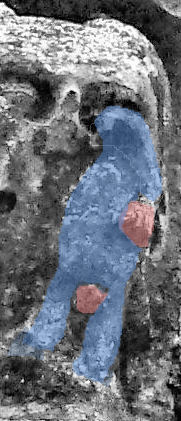 vous voyez , elles ont trois doigts, ou alors un cochon. On dirait un moine, vous devinez une tonsure et peut être derrière sa tête une capuche. Dans ses mains, vous voyez deux objets, ceux-ci pourrait être des bourses ou des flacons.Moine avare ou alchimiste ?