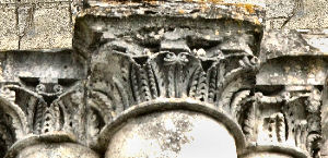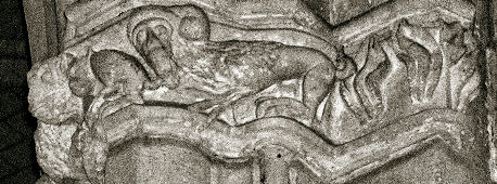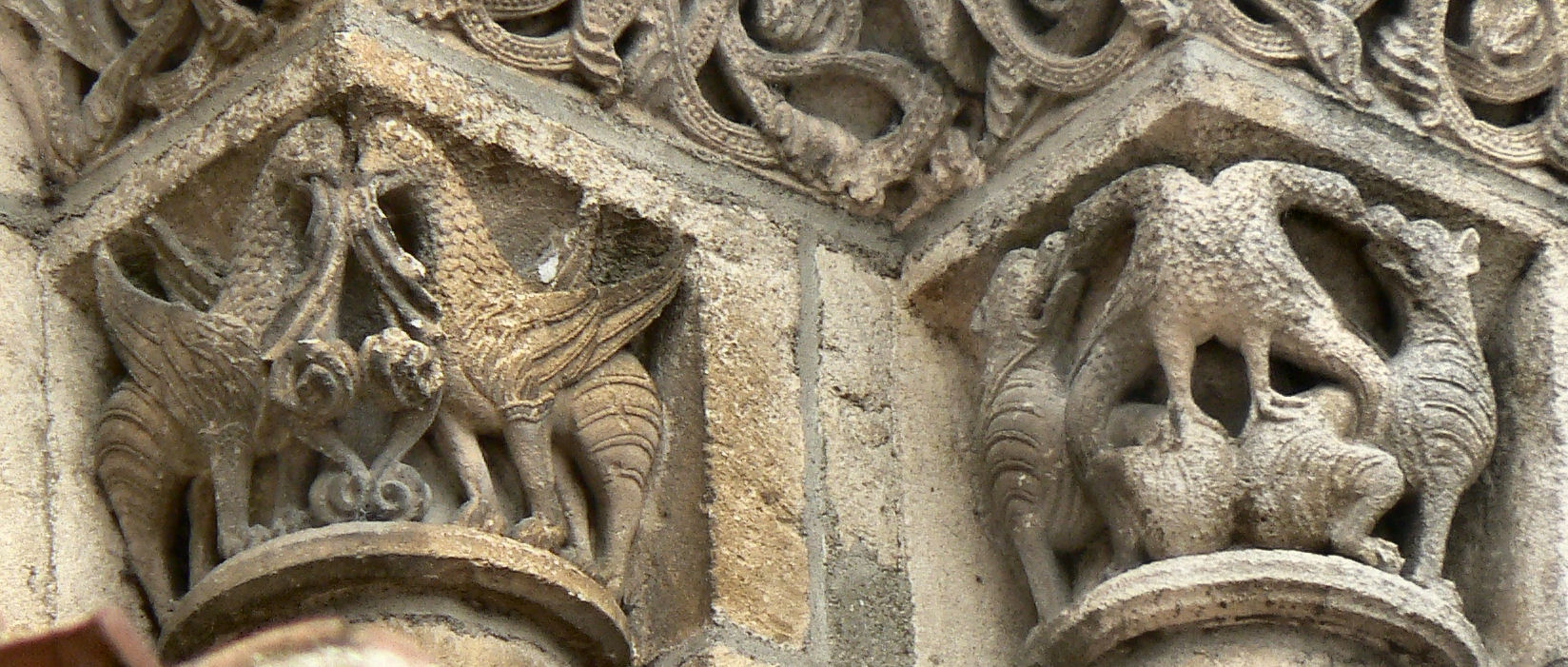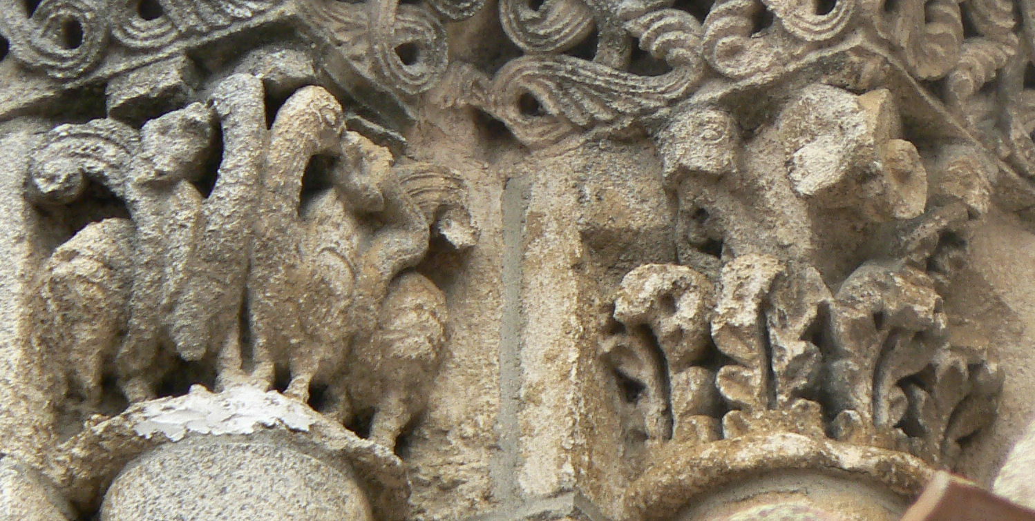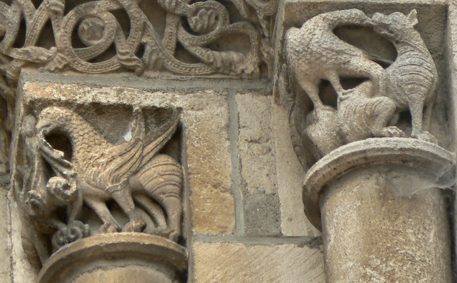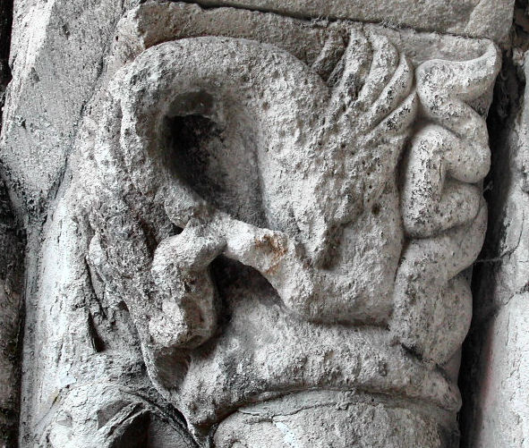 27 - A droite, chapiteau de gauche, deux basilic face à face tenant dans leur bec un feuillage. A droite: deux aigles tête retournée vers l'arrière, chacun monté sur un quadrupède, ils semblent les attaquer à la tête.