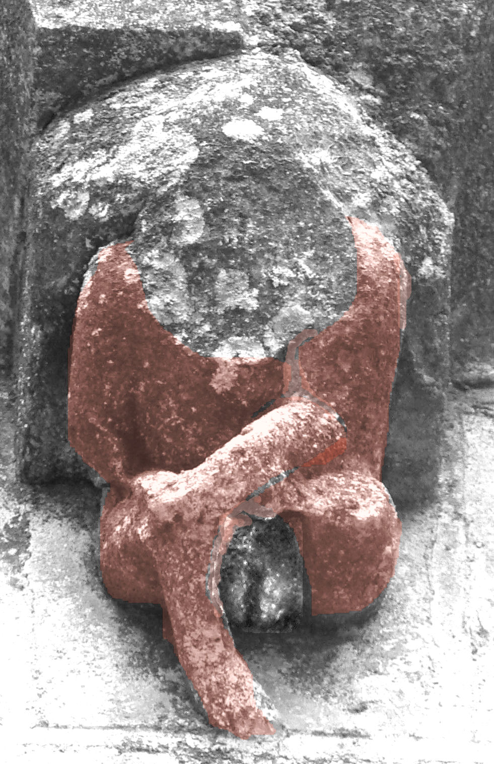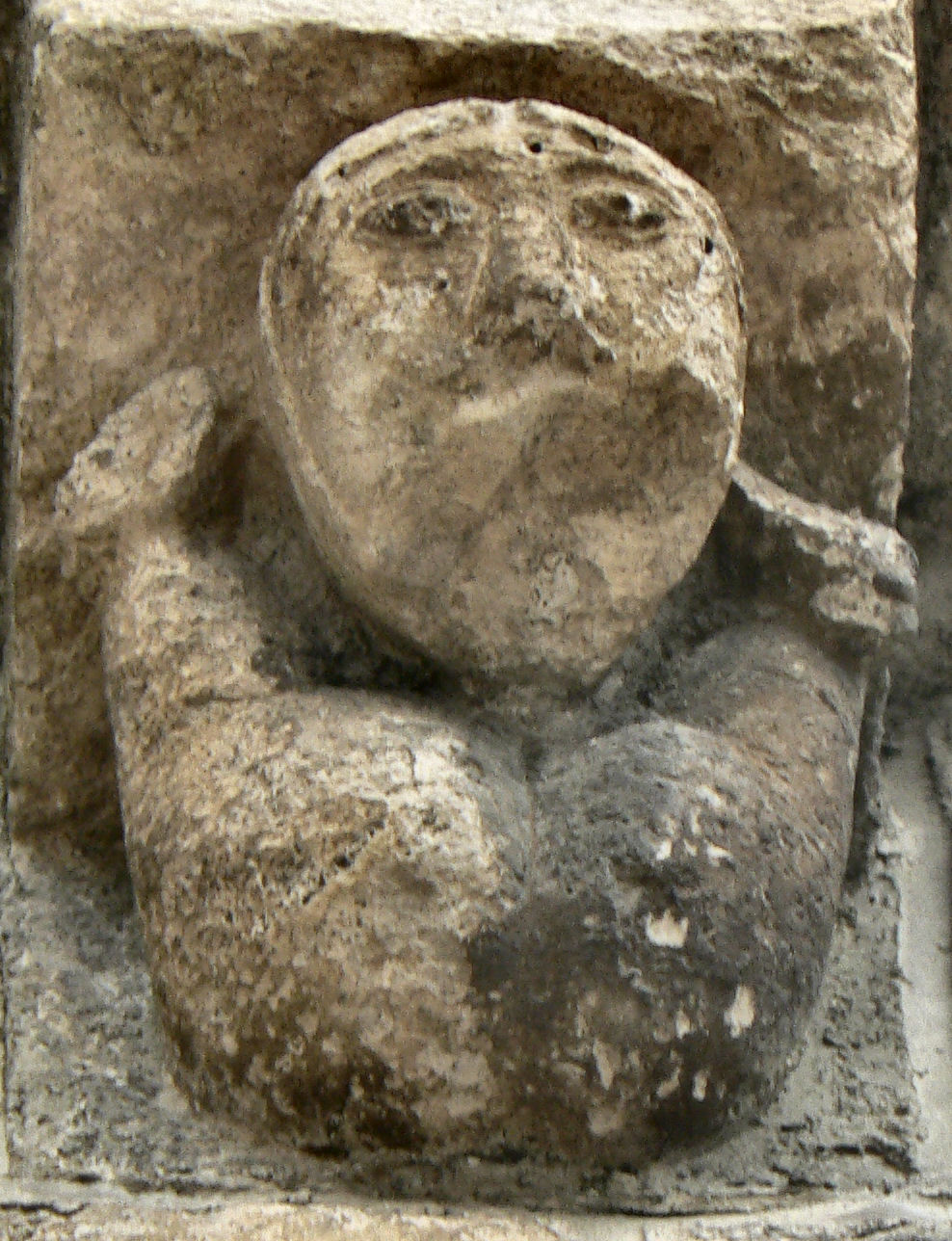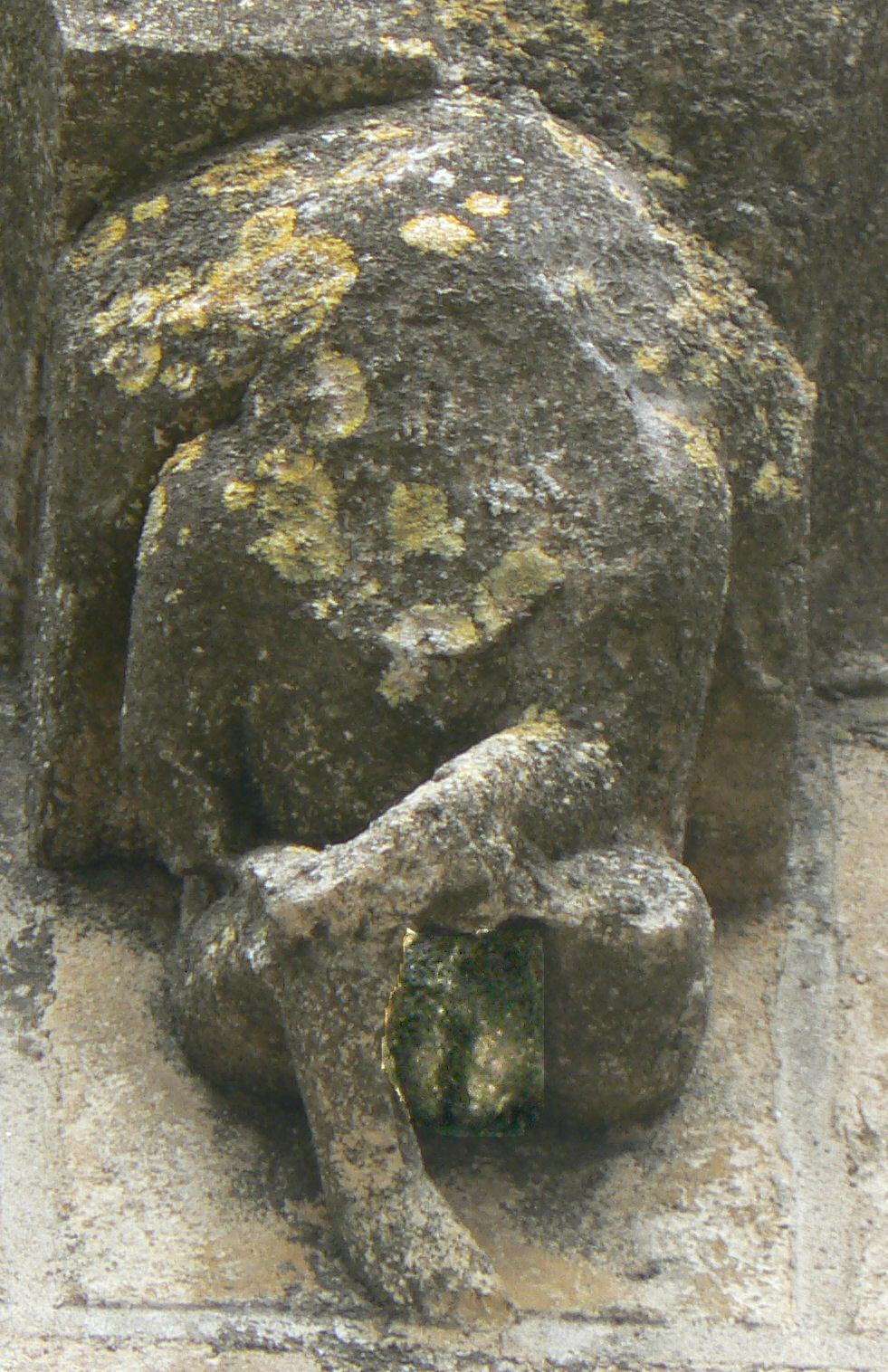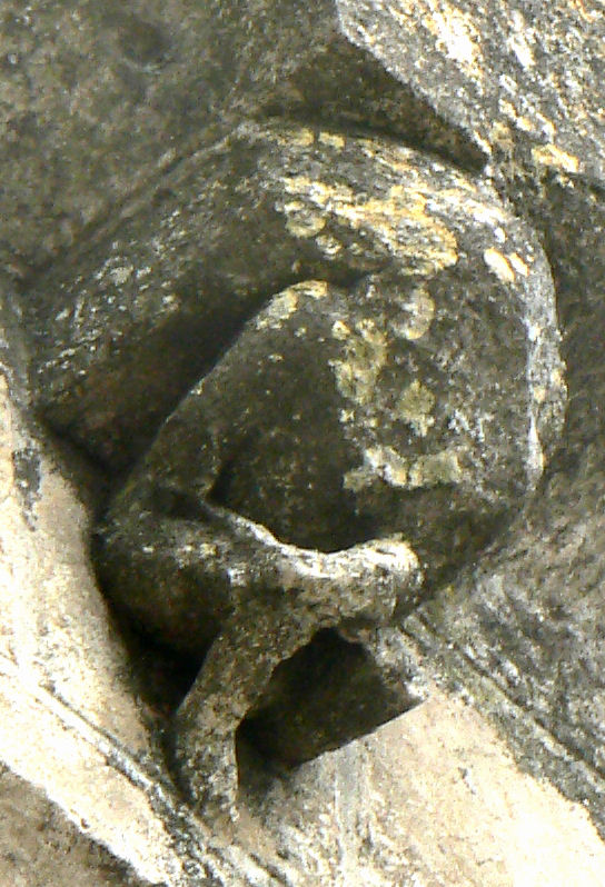 2 – Ce modillon est cassé, il manque la partie supérieure, la tête, juste au dessus du collier. Il s'agit d'un personnage, c'est une femme vous pouvez voir nettement son sexe. Elle pose sa main gauche sur son genou droit, sa jambe gauche est cassée ainsi que son avant bras droit. Réflexion du modillon, j'étais peut être une tireuse d'épine ?