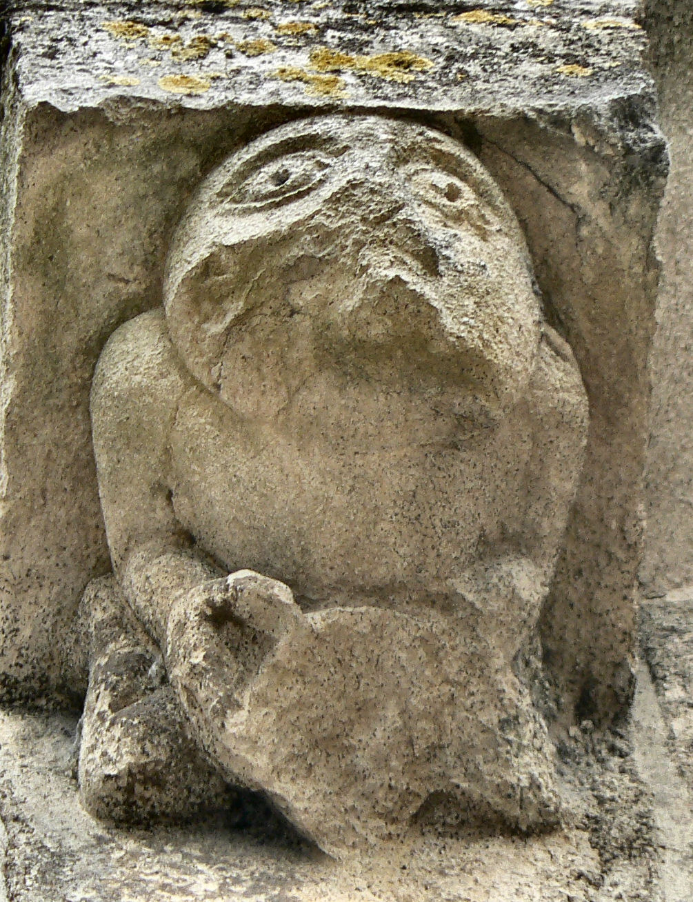 8 8 - Vous voyez ici un modillon assez curieux, en effet , c'est une caricature humaine. C'est un petit homme avec un très gros ventre, il tient dans sa main gauche quelque chose qu'il présente devant sa bouche, nous ne pouvons pas déterminer l'objet.