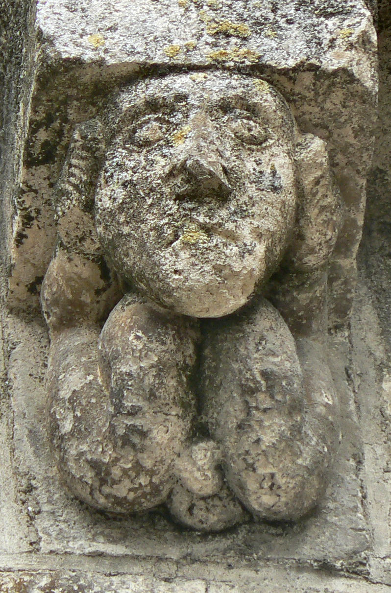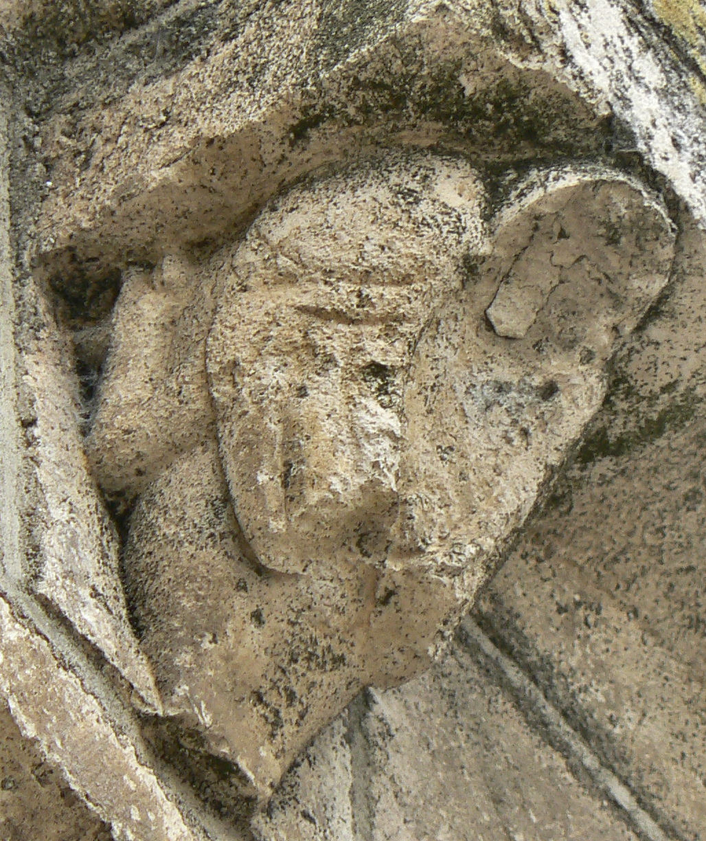 13 13 - Ce modillon devait représenter une tête humaine, abimée avec deux grandes oreilles de lapin. L'artiste a-t-il voulu représenter l'Ignorance ?