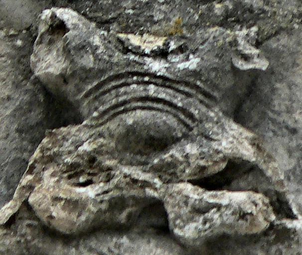 10 10 – Tête d'animal, vous voyez ses cornes de chaque côté de sa tête, elles sont bien plaquées sur les côtés, ce qui n'est pas commun. Est-ce voulu par le sculpteur, par manque de place, dans ce cas là nous voyons un boeuf. On dirait que cette tête est posée sur une sorte de galette.