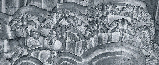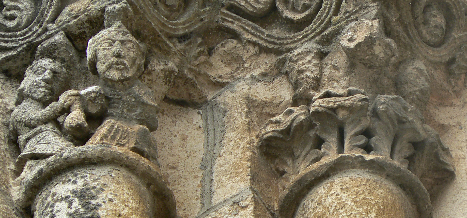 24 Sur le chapiteau de droite, une couronne de feuilles soutien deux masques à tête humaines, un à gauche l'autre à droite. Côté droit: 25