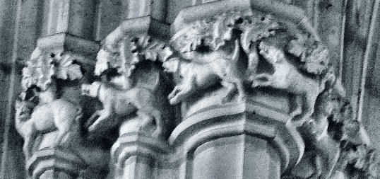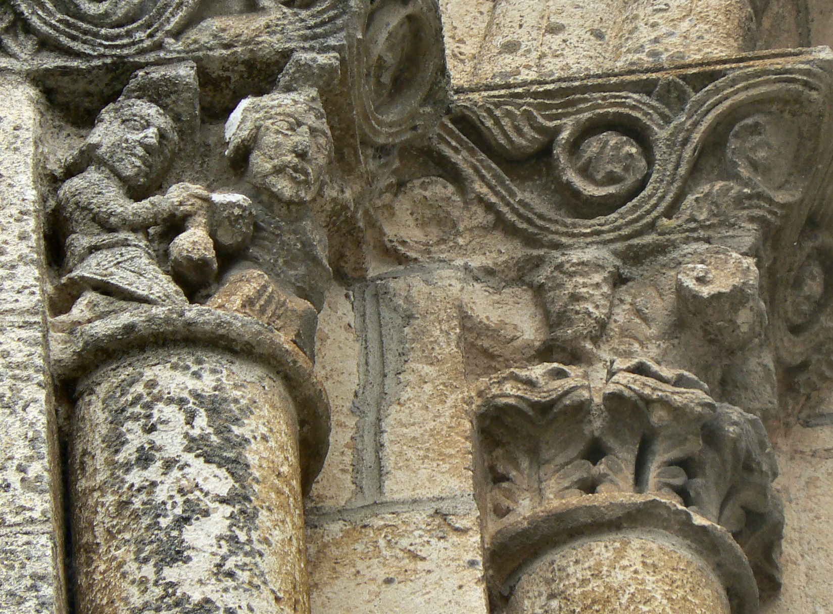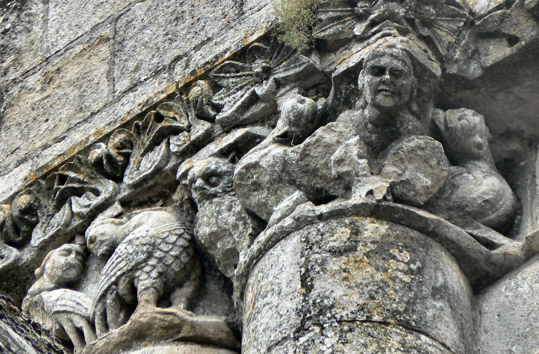 11 –Vu l'habillement de cette tête, on peut dire qu'il s'agit d'une religieuse guimpée. 12 12 - Tête de loup tenant un parchemin enroulé dans sa gueule. Nous revenons au point de départ, c’est-à-dire au modillon n° 1.Certains modillons ne correspondent pas spécialement aux étapes d’un chemin initiatique, c’est dommage, car nous sommes partie avec un loup qui nous enseignait la lumière et nous terminonsun avec un loup qui nous apporte la connaissance. Chapiteaux suportant les deux statues supérieures.