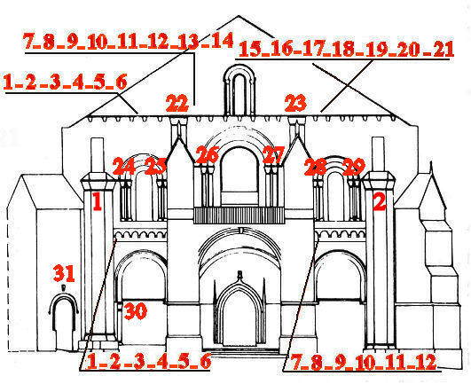28 28 - A gauche, deux quadrupèdes face à face, l'avant du corps plié vers le sol sur les pattes de devant , les pattes arrrière s'appuient sur le haut du chapiteau, l'arrière de leur corps est donc levé, ils ont une queue avec un plumet. Un aigle est posé sur eux et les attaquent. A droite: chapiteau décoré de feuillage, il se pourrait qu'au dessus de la grande feuille sur l'angle se trouve une tête de batracien ? 29 29 - A gauche, chapiteau décoré de feuillage. A droite: Deux oiseaux face à face, leur tête baissée vers le sol sur l'angle du chapiteau, ils semblent picorer le sol. Sur leur dos il semblerait que deux autres oiseaux seraient posés, tête baissée comme les deux autres. Rez-de-Chaussée à gauche du portail: Arcade aveugle gauche: