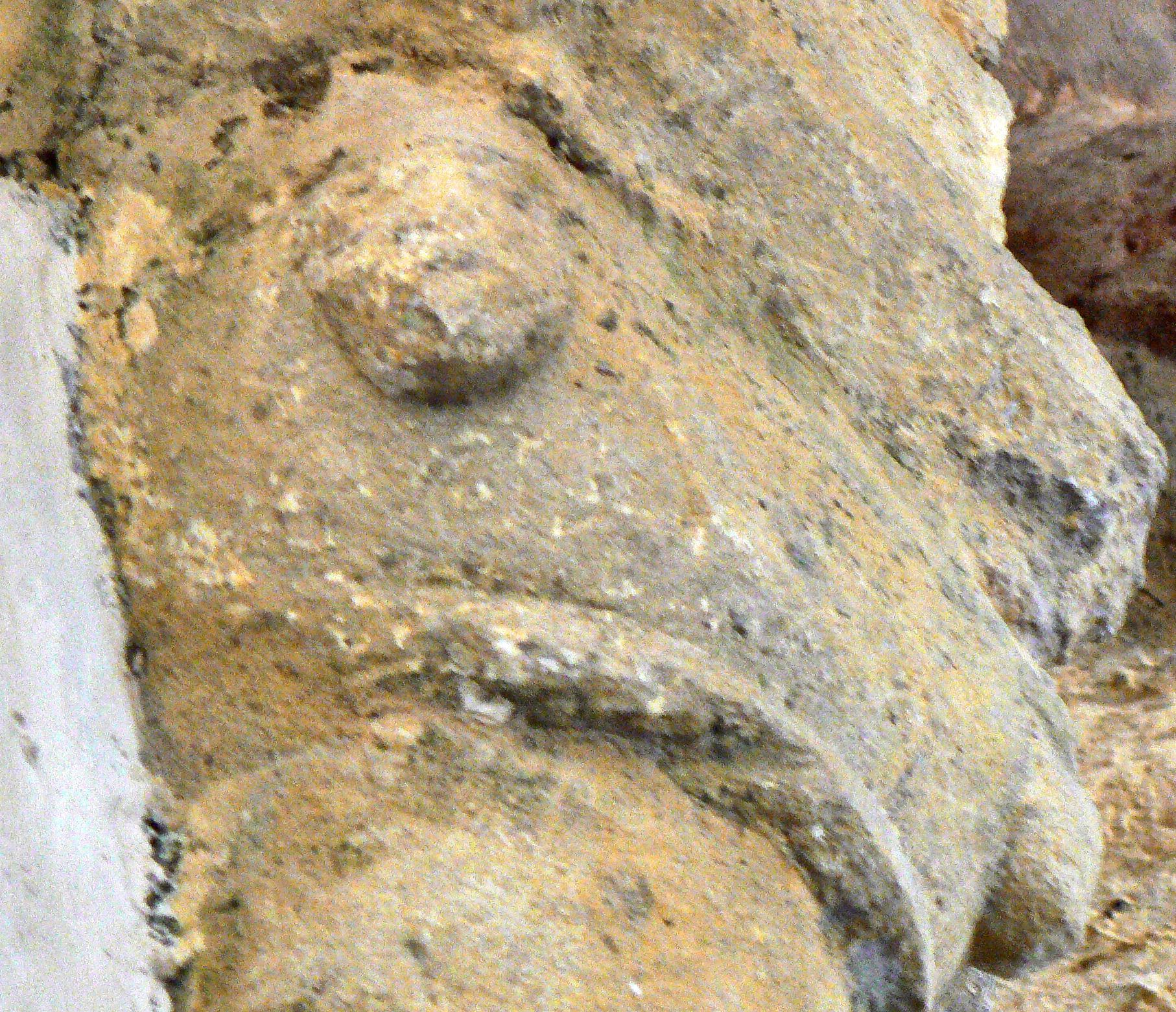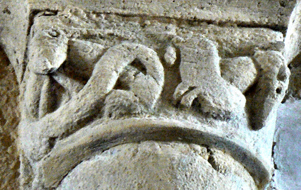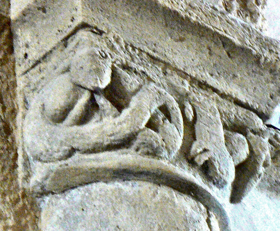 18 - 19 - Modillons vierges 21 - Ce chapiteau est assez spécial dans cette région (il existait encore en 2003) En effet, vous pouvez voir ici un homme assis, sa main droite repose sur son genou droit, mais la main de son bras gauche tient son sexe. Vous voyez aussi à hauteur de sa tête, ce qui semble être un autre visage à moitié caché. Il y a sur ce côté, sous le visage, une grande partie claire qui pourrait être une partie d’un corps, une femme ? La main tenant le sexe pourrait appartenir à la femme.