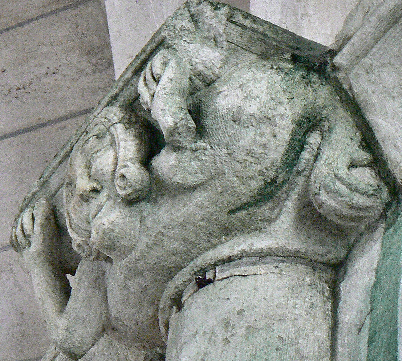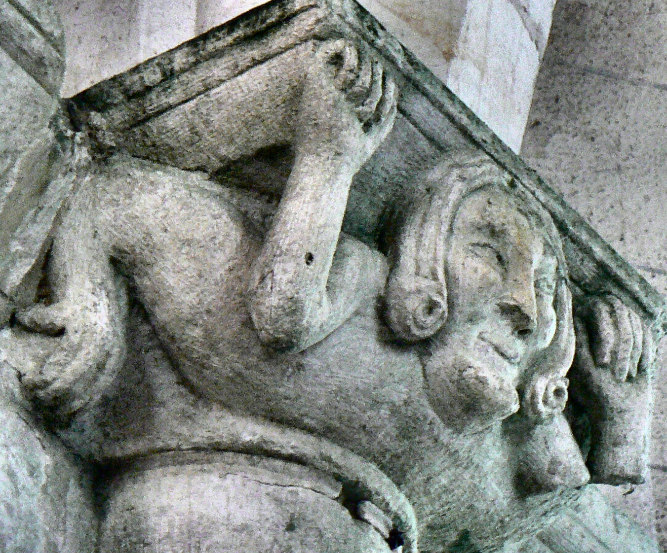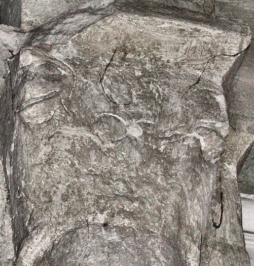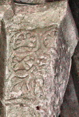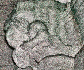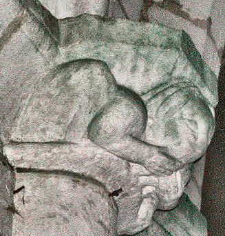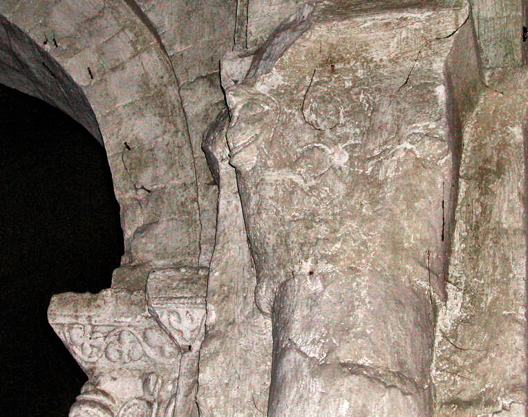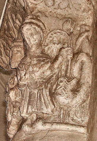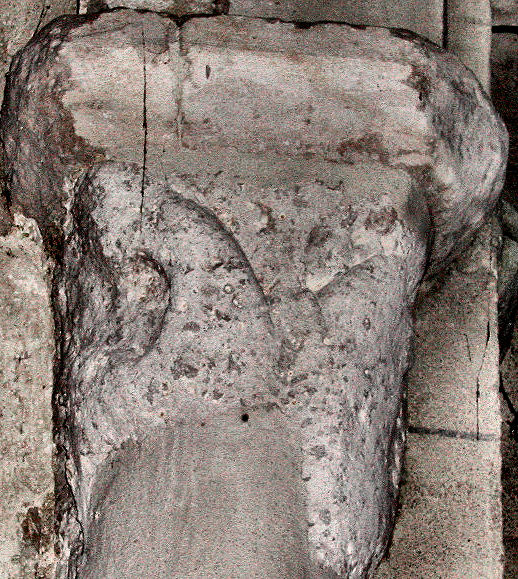 Sur le  côté gauche de ce chapiteau vous voyez : un personnage avec une grande robe, la tête est cassée, dans sa main droite une grande clef, c’est  Saint-Pierre, au-dessus de son épaule droite, une grande  pomme  de  pin, symbole de l' éternité.