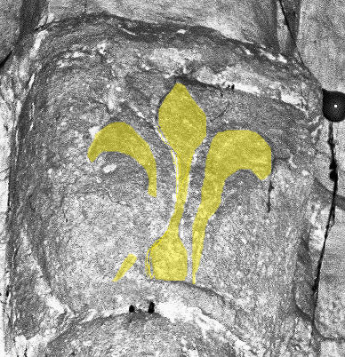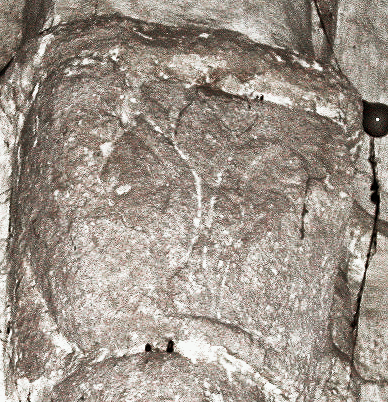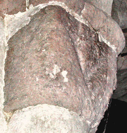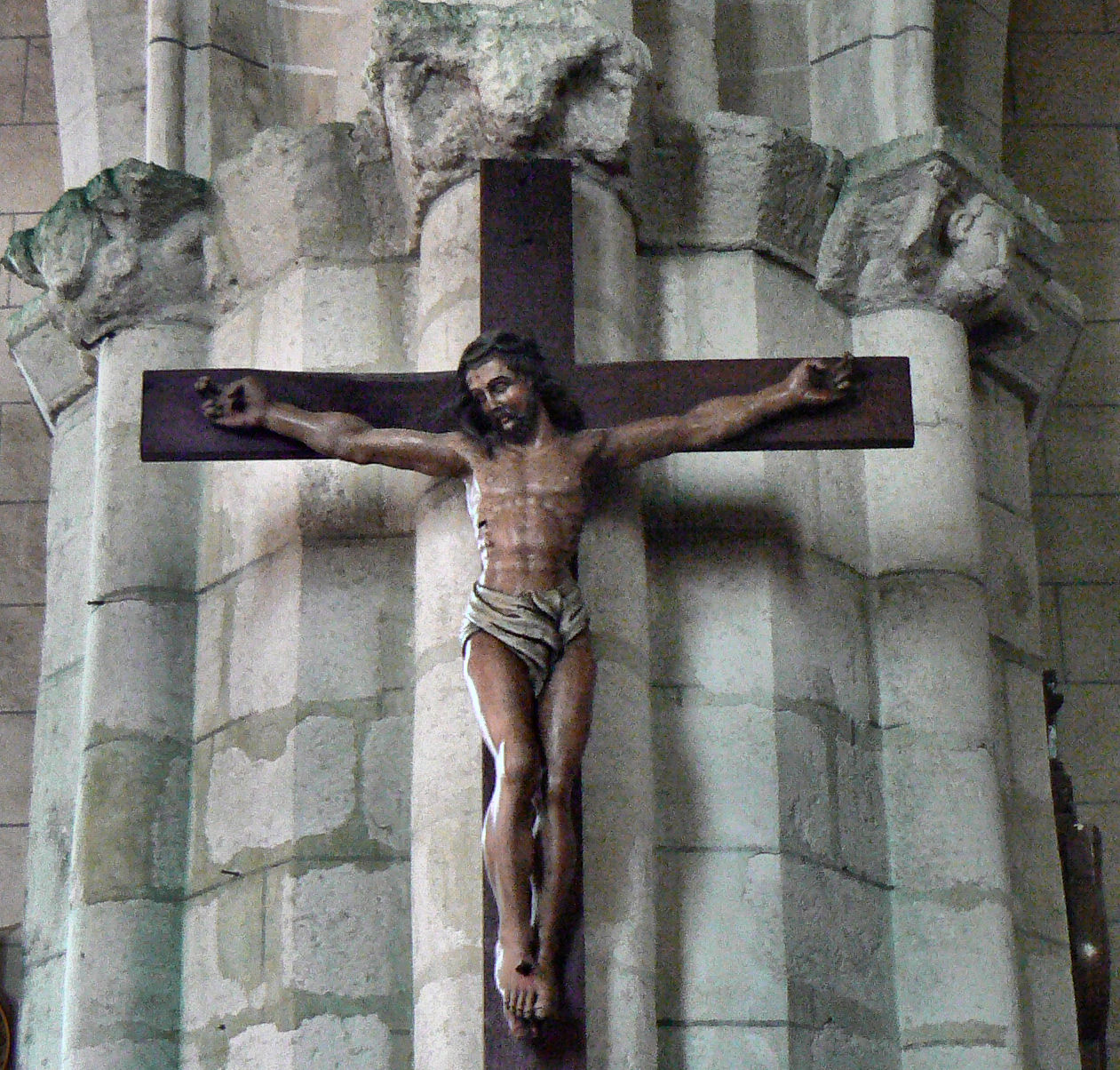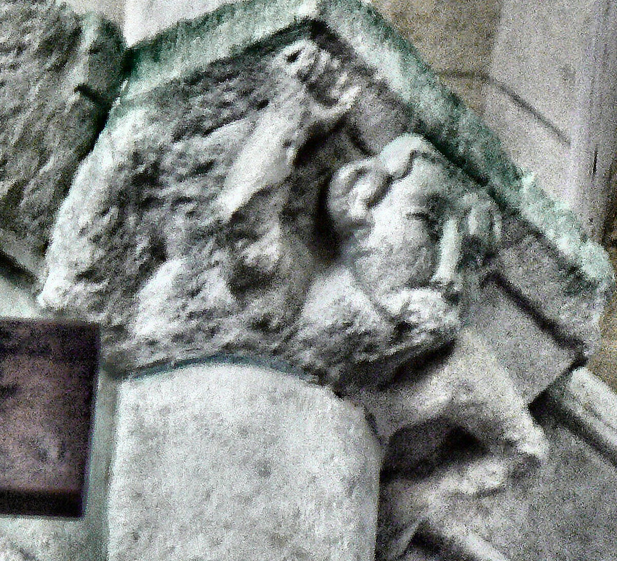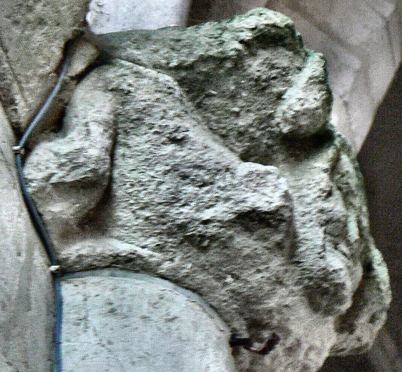 Sur le  côté gauche de ce chapiteau vous voyez : un personnage avec une grande robe, la tête est cassée, dans sa main droite une grande clef, c’est  Saint-Pierre, au-dessus de son épaule droite, une grande  pomme  de  pin, symbole de l' éternité.