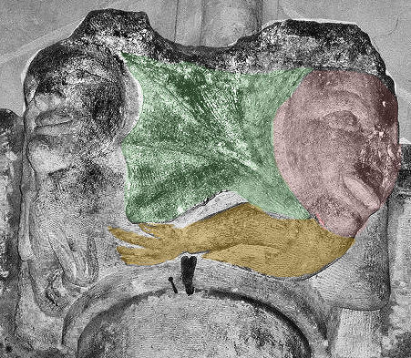 Au milieu un autre personnage nimbé, il pourrait s'agir  de l’évêque Saint-Rémi, on distingue la crosse de son rang, patron de la paroisse,  souhaitant entrée au Paradis. Entre ce personnage et celui de droite, se trouve ce que l’on pourrait prendre pour une méduse, cela est certainement  une Nuée, elle manifeste généralement  l’apparition de la divinité.